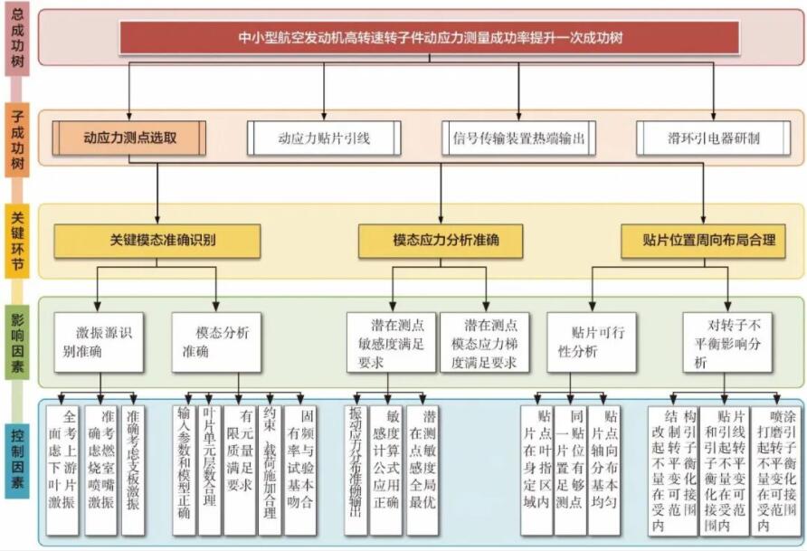 在開展中小型航空發(fā)動機動應力測量技術研究時,創(chuàng)新團隊針對試驗測量精度低、動應力測點失效、信號傳輸裝置損毀等故障現(xiàn)象,應用故障模式和影響過程分析(PFMEA)以及人為因素分析等方法,找到了能夠避免或減少這些潛在失效發(fā)生的措施,建立了循環(huán)反饋的動應力測量流程,在反復迭代中精準定位故障原因,尋求解決措施,主要從測點位置選取、動應力測量貼片引線技術研究、信號傳輸裝置熱端輸出方案設計、滑環(huán)引電器研制等方面實現(xiàn)技術突破。