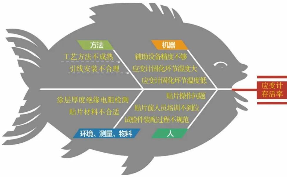 針對高溫火焰噴涂過程中應變計存活率不高的問題,運用頭腦風暴進行因果分析,找出末端原因10個,采用要因確認的排查方法對每一個末端原因進行驗證分析。
